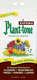 | Plant Tone | general purpose organic plant food by Espoma • sold in 25 lb. plastic bags • for shrubs, flowers and vegetables |